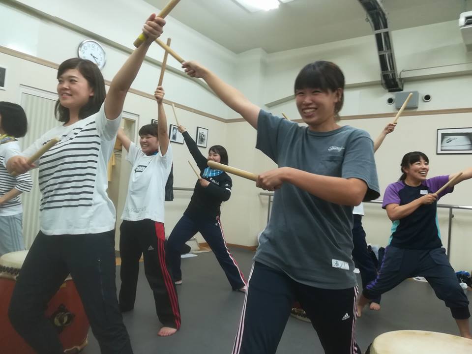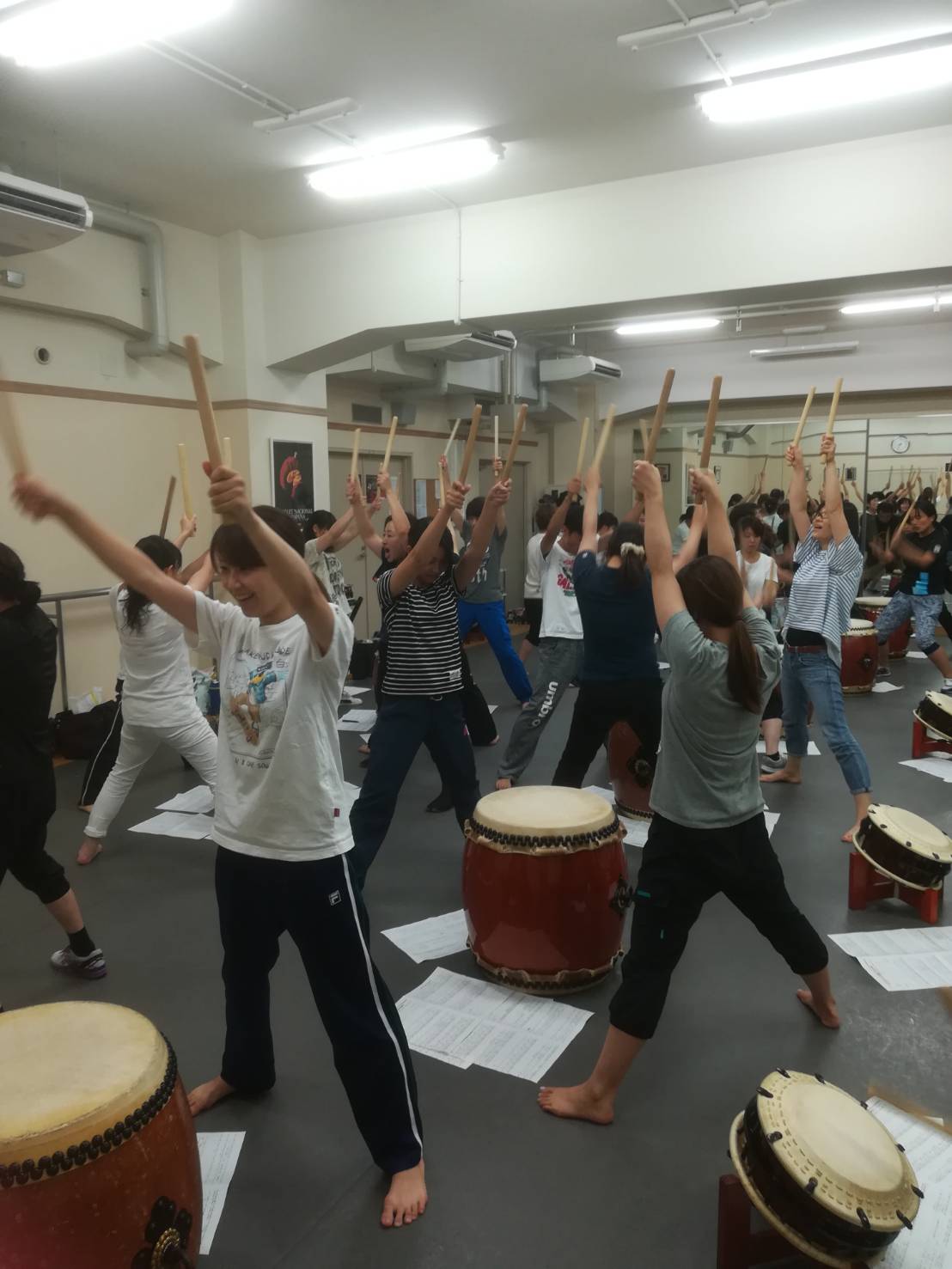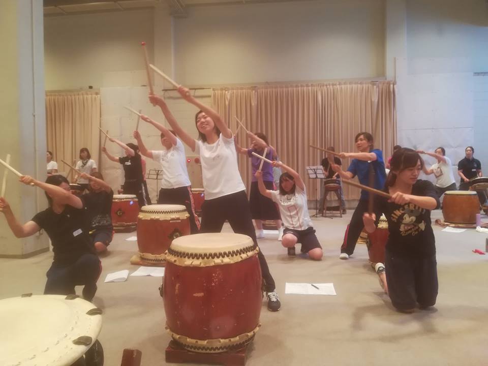 午前は和太鼓教育研究所の長田が担当の「初めてエイサー指導+創作エイサー」、午後は石川が担当の「初めての和太鼓指導基礎編+和太鼓演目」。