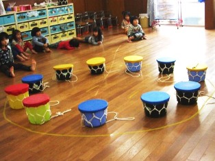 内容:子どもたちは、気持ちいい音、きれいな音や響きが大好きです。発達の道すじに沿って、和太鼓と出会い、他の仲間と楽しくつくるあそびを講習致します。一日目は、心地いい色々な音や動きに出会いたい「3歳児での太鼓あそび」の例。そしてごっこあそび