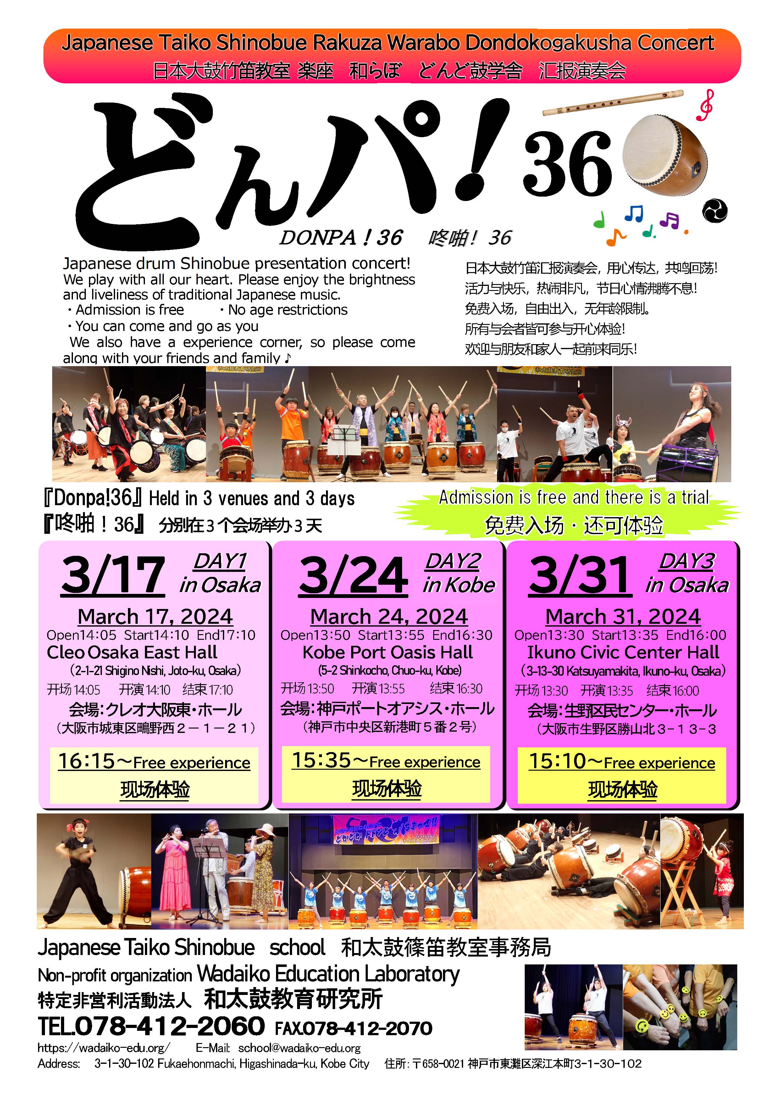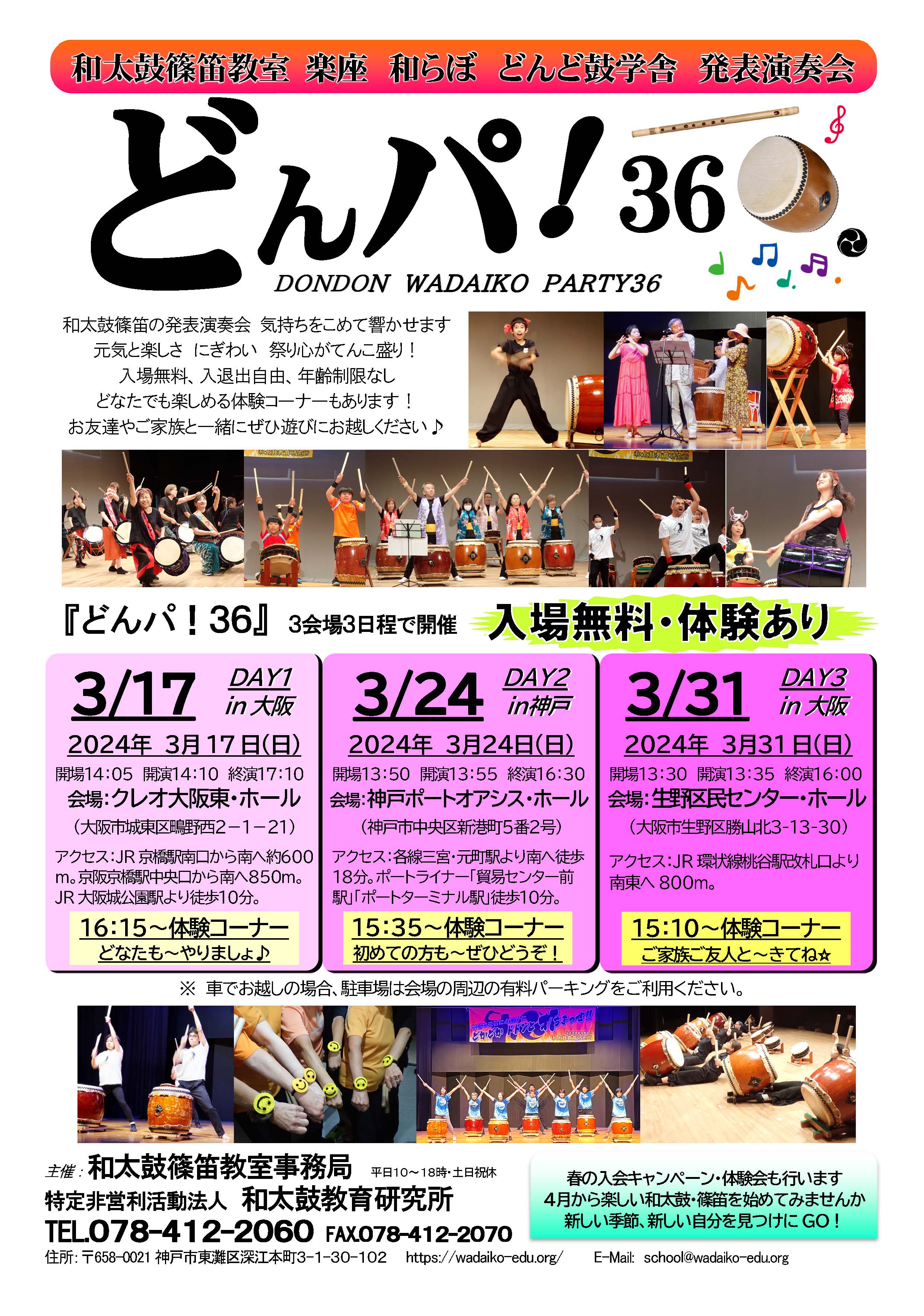 昨日(3/31)関西3会場で開催された和太鼓・篠笛教室“楽座”、和太鼓スクール「和らぼ」、「どんど鼓学舎」の発表会 「どんパ36」が無事に終了いたしました。