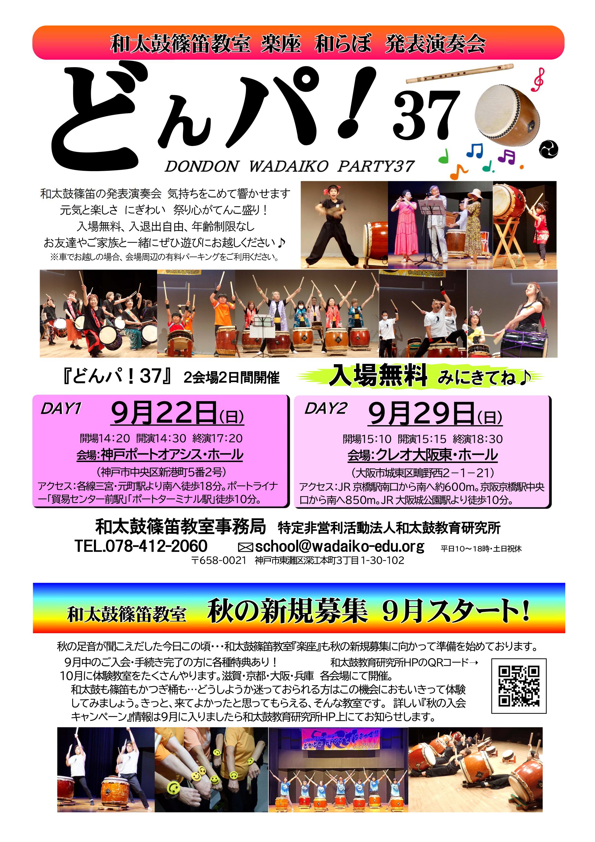 〇出演者:和太鼓教室「楽座」会員有志チーム、青少年和太鼓チーム“和らぼ”教室生、「どんど鼓学舎」(天満橋・柏原・明石)教室生、和太鼓演奏ユニット『采和』(和太鼓教育研究所プロ演奏チーム)、和太鼓教育研究所講師スタッフチーム。 スペシャルゲスト「滝川第二高等学校 吹奏楽部」